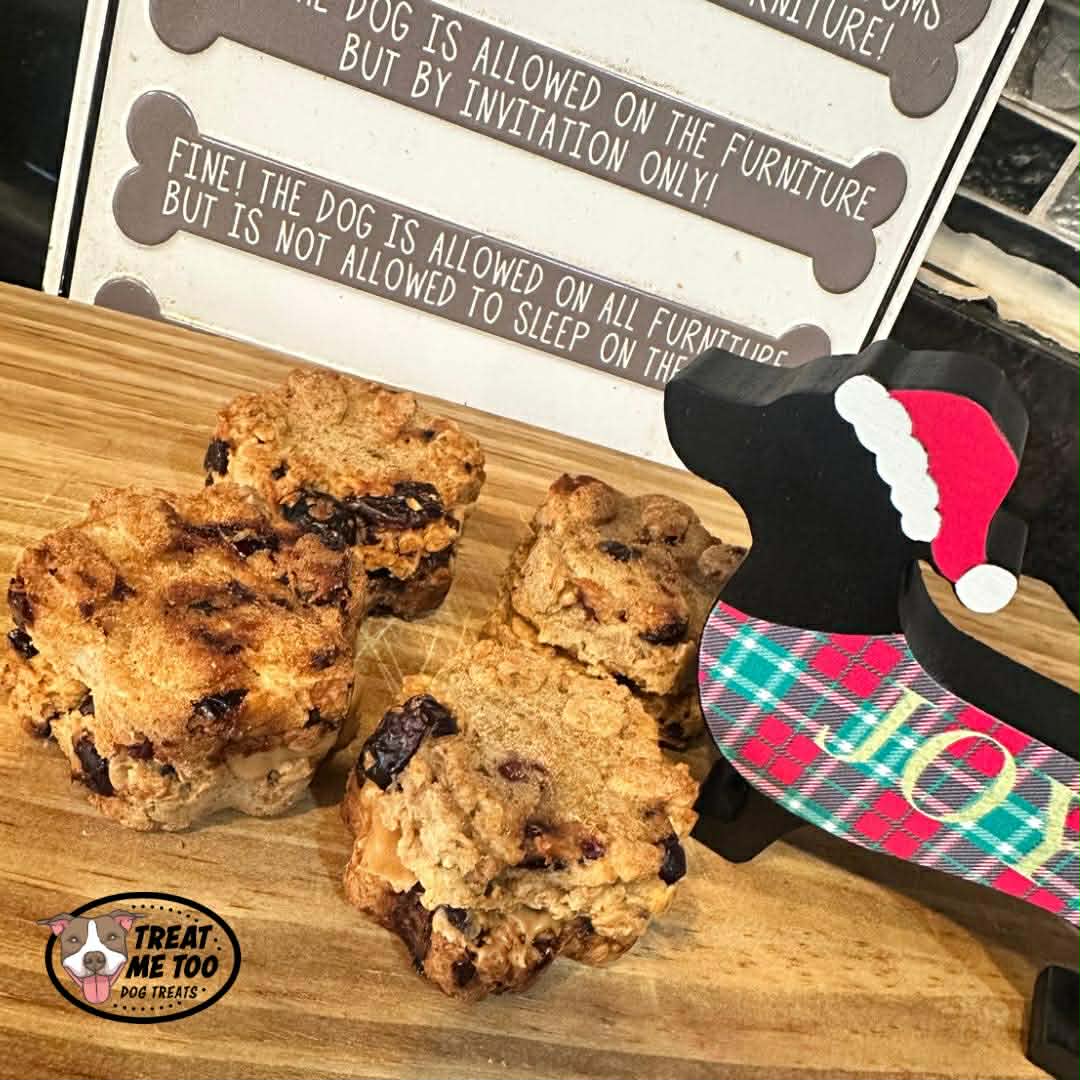 Made with oats, cranberries, peanut butter, and egg — a festive, wholesome bite for every good pup!